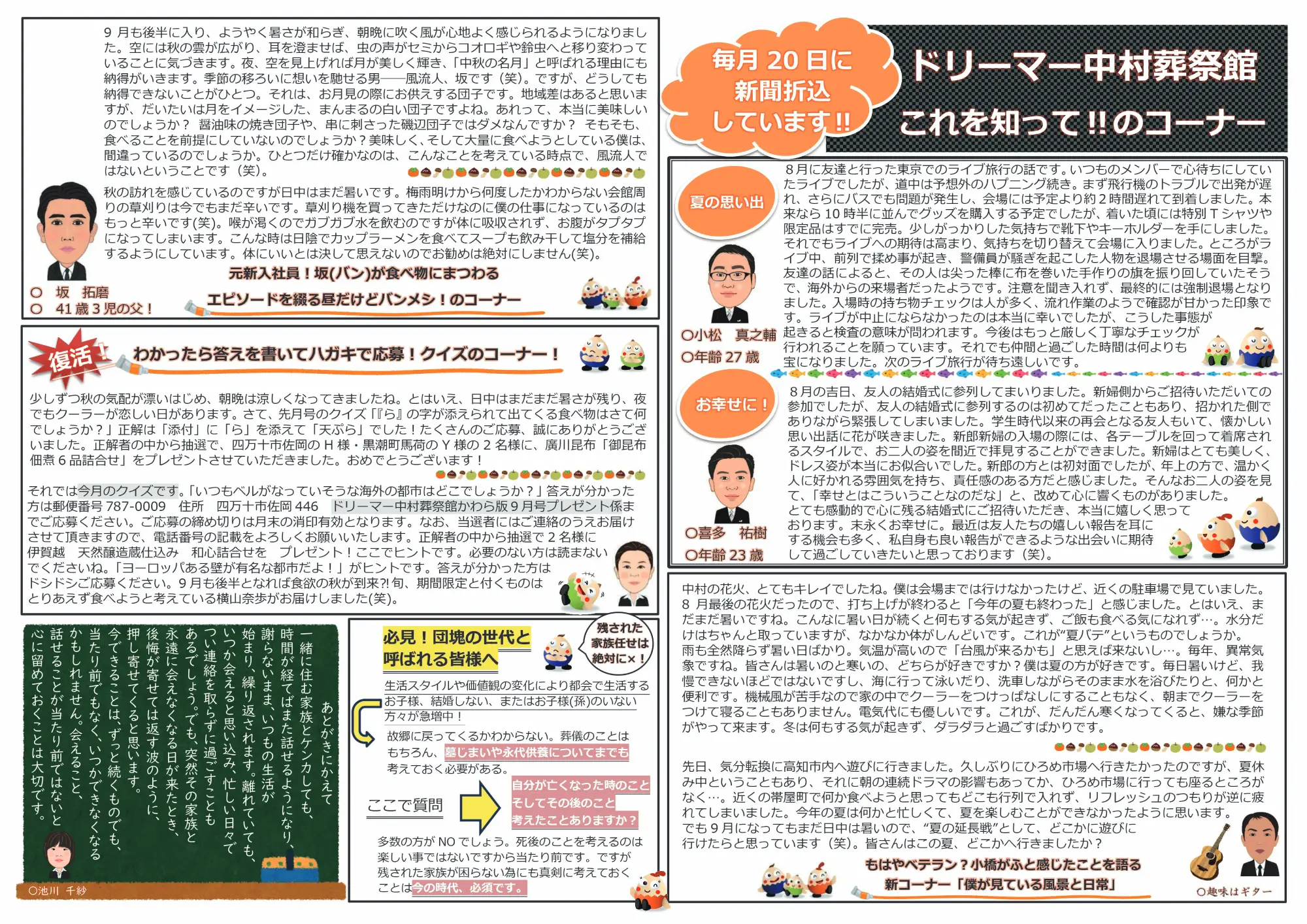 【葬儀かわら版】第148号を発行しました 葬儀かわら版第148号を発行しました。 四万十市(旧中村)を中心にお葬儀や法要の知っておくと為になる豆知識や、葬祭スタッフの近況など色々な情報を掲載しておりますので是非ご覧ください。 前の記事へ